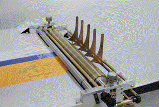 制作臺歷架演示 在SK840A書殼機上更換定位擋塊,就可快速批量完成標準臺歷架的制作。 |
